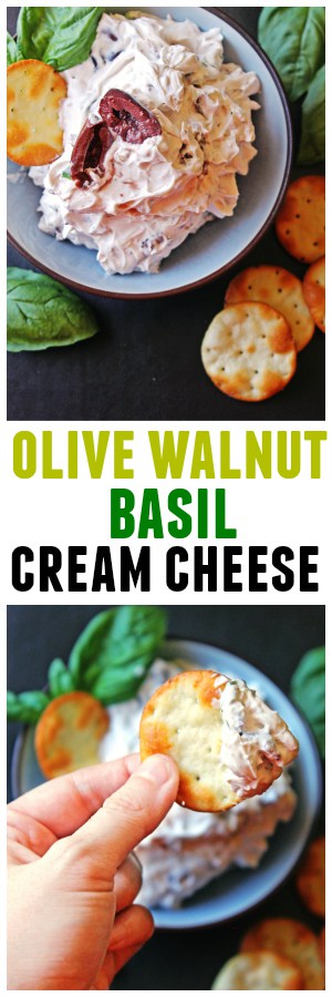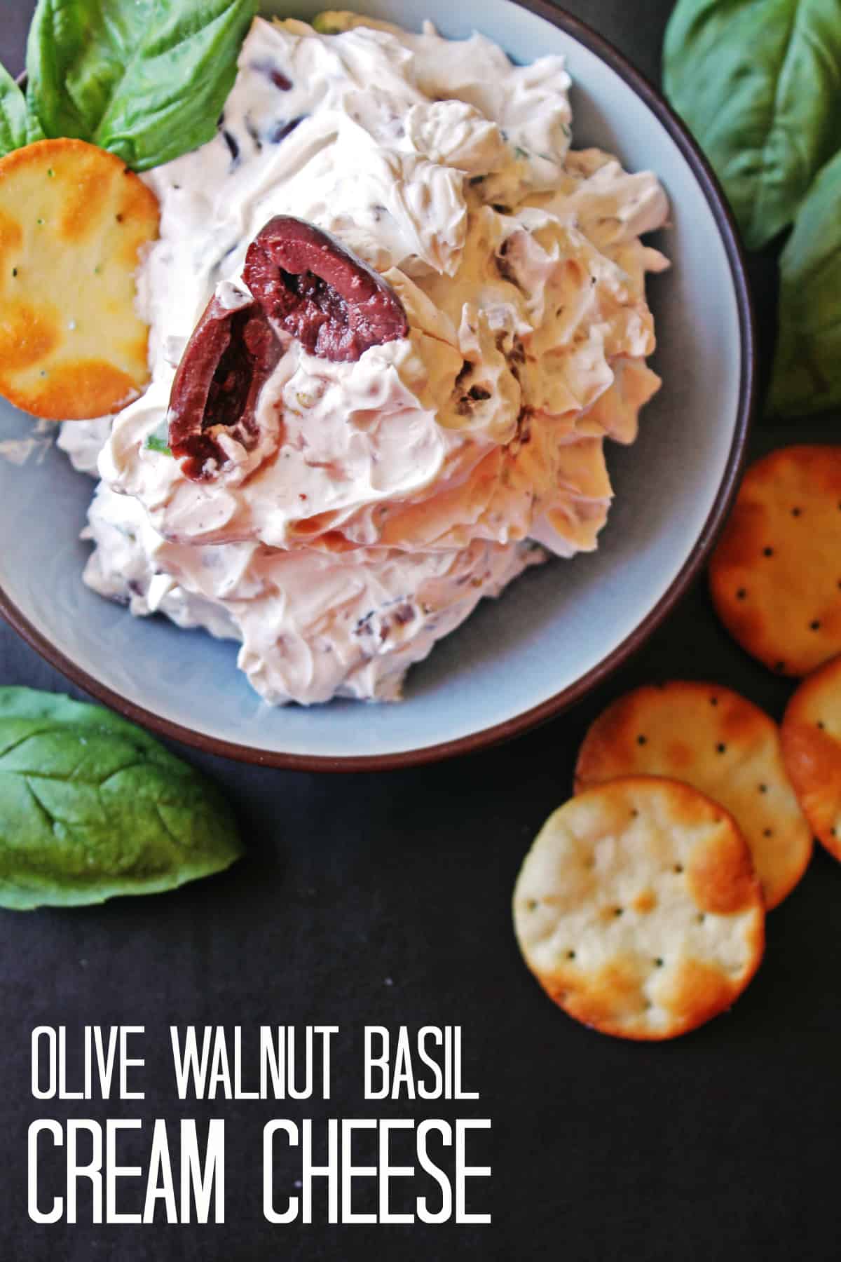 Olive walnut basil cream cheese will be your new favorite dip or spread! Olive brine and olives are whipped into cream cheese, followed by walnuts and fresh basil.